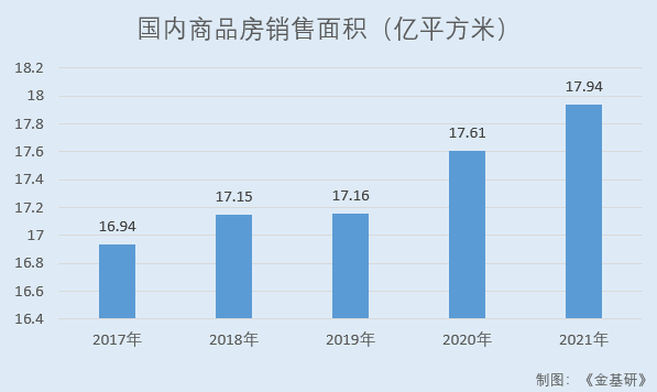 同期,国内商品房销售面积分别为16.94亿平方米、17.15亿平方米、17.16亿平方米、17.61亿平方米、17.94亿平方米。