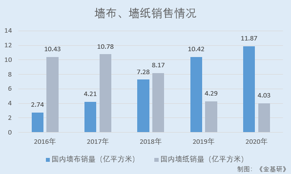 2016-2020年,国内墙布销量分别为2.74亿平方米、4.21亿平方米、7.28亿平方米、10.42亿平方米、11.87亿平方米。