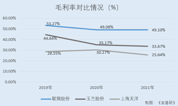 2019-2021年,联翔股份的毛利率分别为53.26%、49.07%、49.19%。同期,联翔股份同行业可比公司广东玉兰集团股份有限公司(以下简称“玉兰股份”)的毛利率分别为44.64%、35.17%、33.67%;上海天洋热熔粘接材料股份有限公司(以下简称“上海天洋”)的毛利率分别为28.55%、30.27%、25.64%。