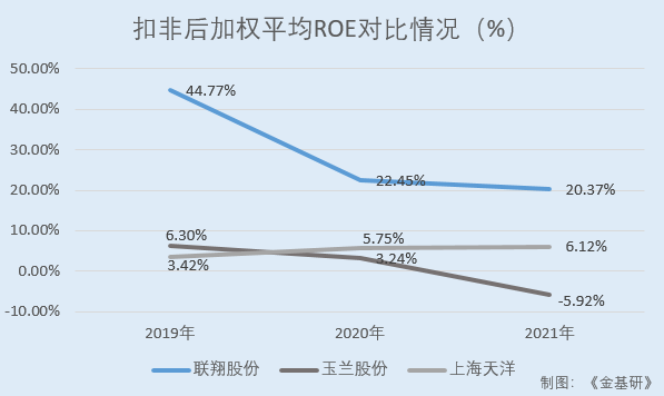 2019-2021年,联翔股份的扣非后加权平均ROE分别为44.77%、22.45%、20.37%。同期,联翔股份同行业可比公司玉兰股份的扣非后加权平均ROE分别为6.3%、3.24%、-5.92%;上海天洋的扣非后加权平均ROE分别为3.42%、5.75%、6.12%。