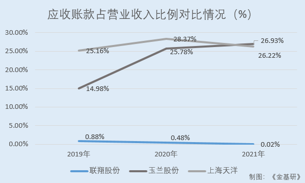 同期,联翔股份同行业可比公司玉兰股份的应收账款占营业收入比例分别为14.98%、25.78%、26.93%;上海天洋的应收账款占营业收入比例分别为25.16%、28.37%、26.22%。