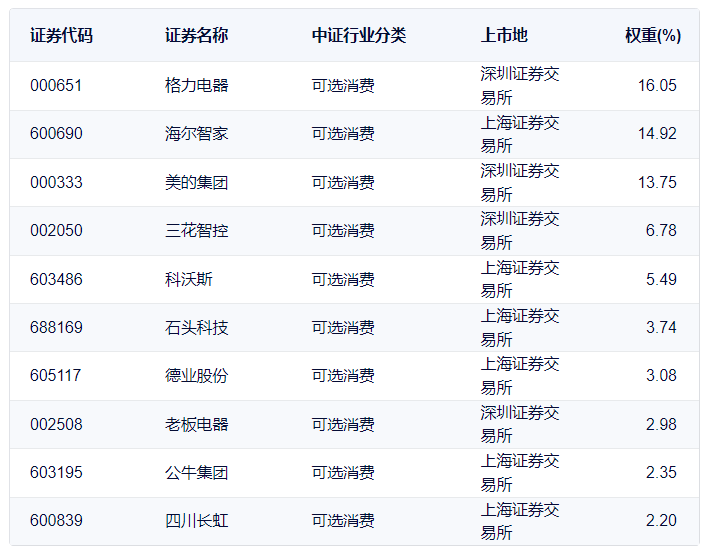 广发中证全指家用电器ETF(代码:560880,场内简称:家电ETF基金)跟踪中证全指家用电器指数,该指数2005年-2022年5月累计收益率824%,年化收益13.6%。截至6月6日,中证全指家用电器指数共有53只样本,前十大分别为格力电器、美的集团、海尔智家、三花智控、科沃斯、石头科技、老板电器、德业股份、四川长虹、公牛集团等知名家电企业,龙头集中特征突出。