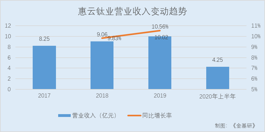 2017-2019年及2020年上半年,惠云钛业的营业收入分别为8.25亿元、9.06亿元、10.02亿元、4.25亿元,2018-2019年分别同比增长9.83%、10.56%。