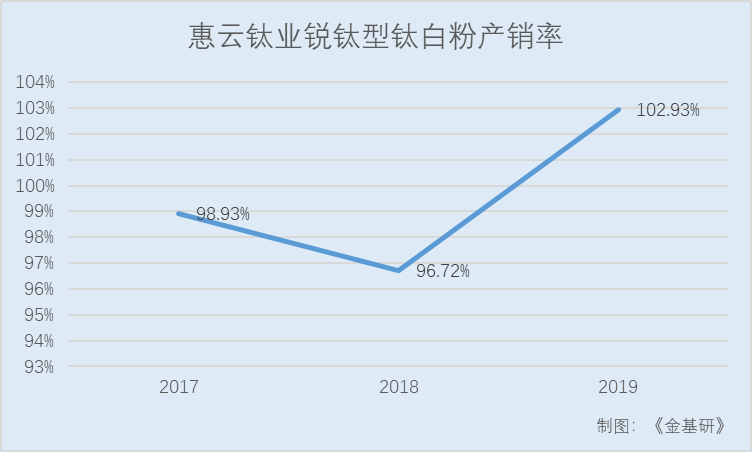 2017-2019年,惠云钛业锐钛型钛白粉的的产销率分别为98.93%、96.72%、102.93%。