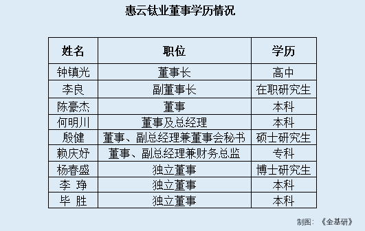 其中,惠云钛业的副董事长李良为在职研究生学历,董事陈豪杰为本科学历,董事及总经理何明川为本科学历,董事、副总理兼董事会秘书殷健为硕士研究生学历,独立董事杨春盛为博士研究生学历,独立董事李琤、毕胜均为本科学历。