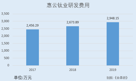 2017-2019年,惠云钛业的研发费用分别为2,456.29万元、2,673.89万元、2,948.15万元。