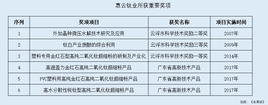 与此同时,2017-2019年,惠云钛业及惠云钛业的核心技术人员获得的主要奖项共有6项。