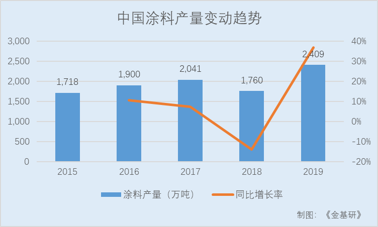 伴随着中国房地产行业的稳步发展,其上游行业,涂料行业也在2019年得到“回升”,产量大幅增长。