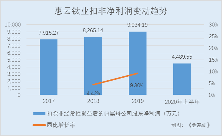 同期,惠云钛业的扣除非经常性损益后归属于母公司股东的净利润分别为7,915.27万元、8,265.14万元、9,034.19万元、4,489.55万元,2018-2019年分别同比增长4.42%、9.3%。