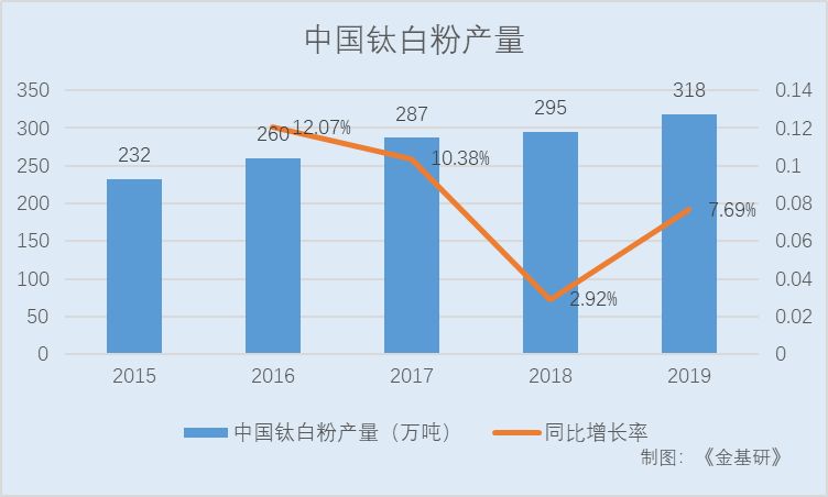 据招股书,2015-2019年,中国钛白粉的产量分别为232万吨、260万吨、287万吨、295万吨、318万吨,2016-2019年分别同比增长12.07%、10.38%、2.92%、7.69%。