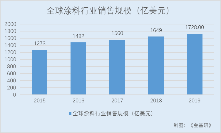 据招股书,2015-2019年,全球涂料行业销售规模分别为1,273亿美元、1,482亿美元、1,560亿美元、1,649亿美元、1,728亿美元,2016-2019年分别同比增长16.40%、5.30%、5.70%、4.80%。
