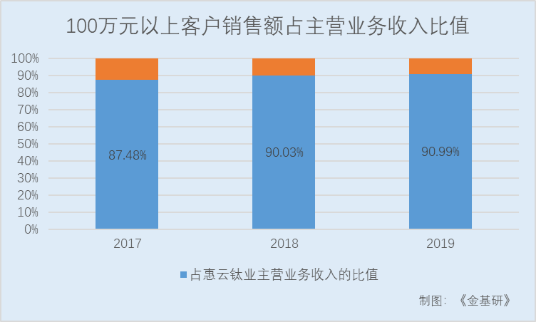 2017-2019年,惠云钛业销售额在100万元以上的客户数量分别为139家、138家、155家,销售额占主营业务收入比重占比分别为87.48%、90.03%、90.99%。