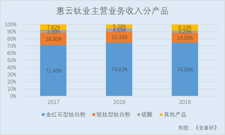 2017-2019年,金红石型钛白粉占惠云钛业主营业务收入的比值分别为71.49%、74.63%、74.56%,锐钛型钛白粉占惠云钛业主营业务收入的比值分别为16.9%、15.35%、14.05%,硫酸占惠云钛业主营业务收入的比值分别为3.99%、4.65%、3.29%,其他产品占惠云钛业主营业务收入的比值分别为7.62%、5.38%、8.1%。