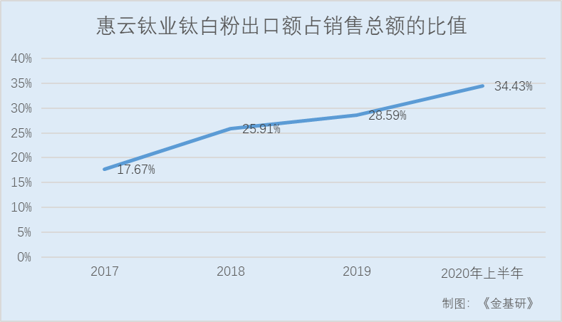 而近年来,外销收入占惠云钛业收入的比值也在不断增长。2017-2019年及2020年上半年,惠云钛业钛白粉产品出口金额分别为1.29亿元、2.11亿元、2.54亿元、1.3亿元,占公司钛白粉销售总额的比值分别为17.67%、25.91%、28.59%、34.43%。