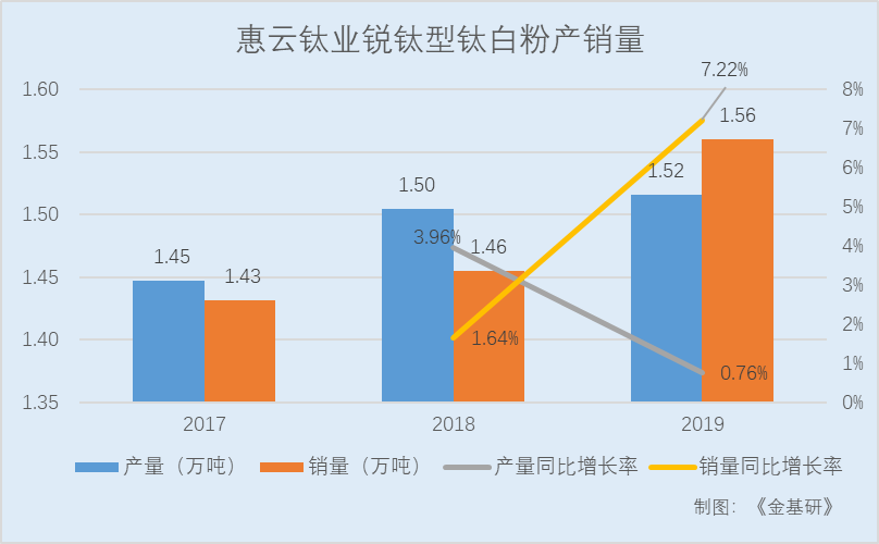 同期,惠云钛业锐钛型钛白粉的销量分别为1.43万吨、1.46万吨、1.56万吨,2018-2019年分别同比增长1.64%、7.22%。