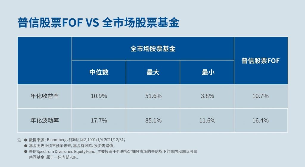 普信(T. Rowe Price)于1990年推出了光谱多元股票FOF。1991年至2021年底的31年间,这只FOF实现了10.7%的年化收益率。同一时期,市场上数据完整的股票基金共有212只,在这212只基金中,年化收益率最高的达到51.6%,最低的只有3.8%。普信股票FOF与这些股票基金相比,年化收益率并不算突出,比中位数还稍微落后了一些,排名刚挤进前60%。