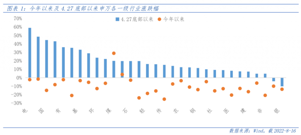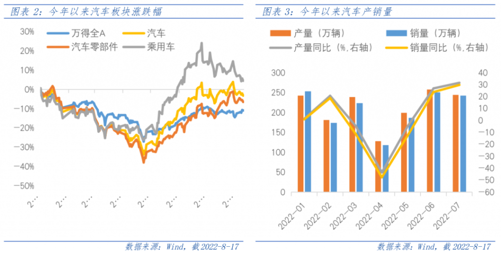 年初以来,受疫情封控、原材料涨价、芯片短缺等因素拖累,3、4月份汽车产销量大幅下滑,叠加市场风偏下行,汽车板块出现回调。4月底,新增新冠病例数见顶回落、复工复产边际改善,市场风偏回暖,汽车板块实现销量和股价的双重筑底。