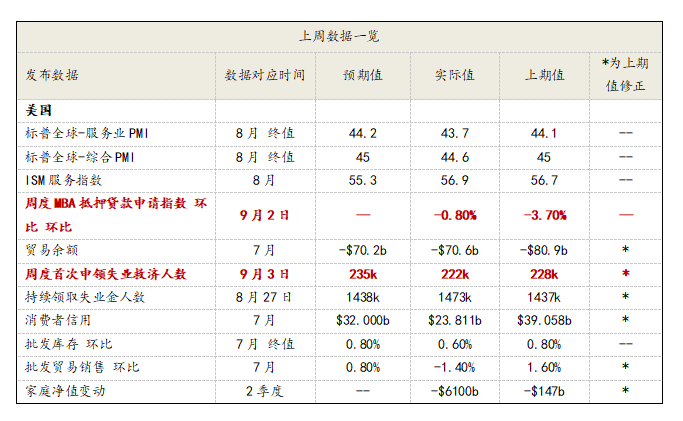 美国宏观经济方面,生产经营活动表现不佳,标普PMI继续维持在荣枯线以下。其中,美国标准普尔服务业PMI的8月终值43.7,低于预期值44.2和前值44.1;标准普尔综合PMI的8月终值44.6,低于预期值45和前值45。