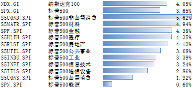 上周,纳斯达克100指数整周上涨4.05%。标普500指数整周上涨3.65%,其覆盖的11个行业板块全部上涨。其中,非必需消费领涨上涨5.62%,而能源仅上涨0.60%。