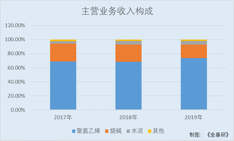 2017-2019年,北元集团聚氯乙烯的销售收入占主营业务收入的比例分别为68.67%、68.22%、73.67%;烧碱的销售占比分别为25.38%、24.78%、19.22%;水泥的销售占比分别为3.61%、5.11%、5.16%;其他的销售占比分别为2.34%、1.89%、1.95%。