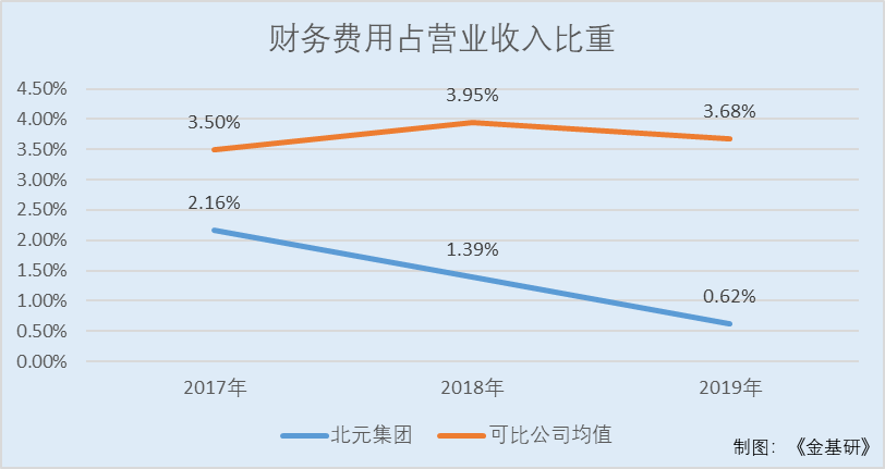 随着北元集团经营业绩向好,北元集团借款金额逐年下降,利息支出逐年下降,使得其财务费用占营业收入比重远低于同行业均值。