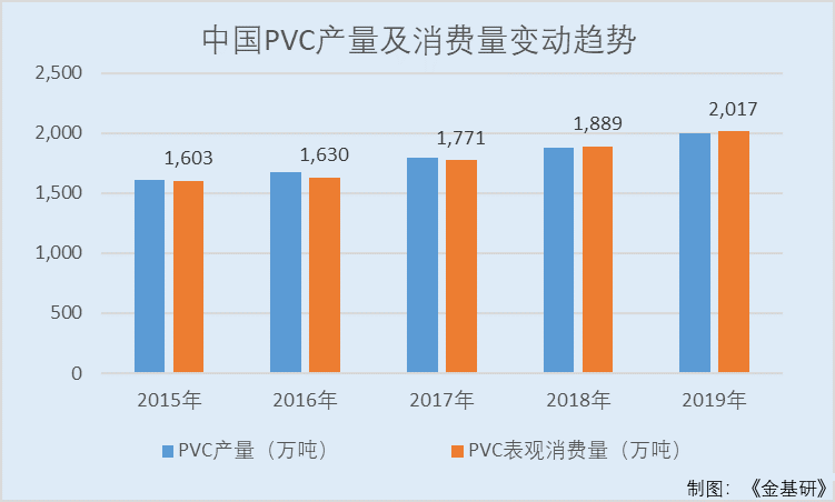 2015-2019年,国内PVC产量分别为1,609万吨、1,669万吨、1,790万吨、1,874万吨、2,000万吨;同期,国内PVC表观消费量分别为1,603万吨、1,630万吨、1,771万吨、1,889万吨、2,017万吨。