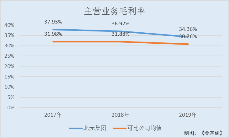 观其毛利率的情况,北元集团的主营业务毛利率仅逊色于君正集团,2017-2019年,北元集团的主营业务毛利率分别为37.93%、36.92%、34.36%。
