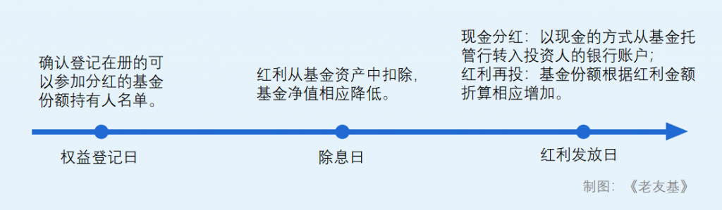 基金分红时,一般会有三个关键的日期:权益登记日、除息日、红利发放日。