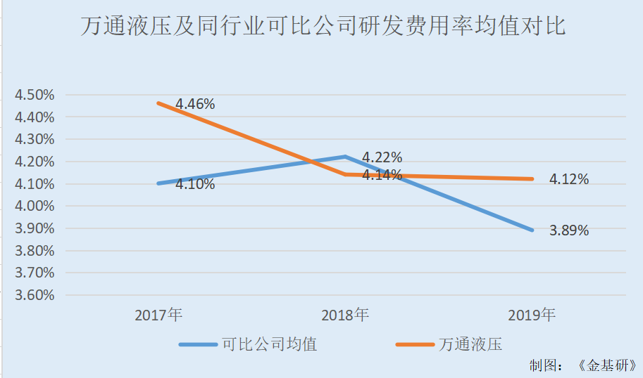 2017-2019年,万通液压的研发费用率分别为4.46%、4.14%、4.12%。
