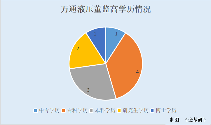苏金杰,万通液压监事会主席,大专学历;梅秀香,万通液压监事,大专学历;陈光,万通液压监事,研究生学历。