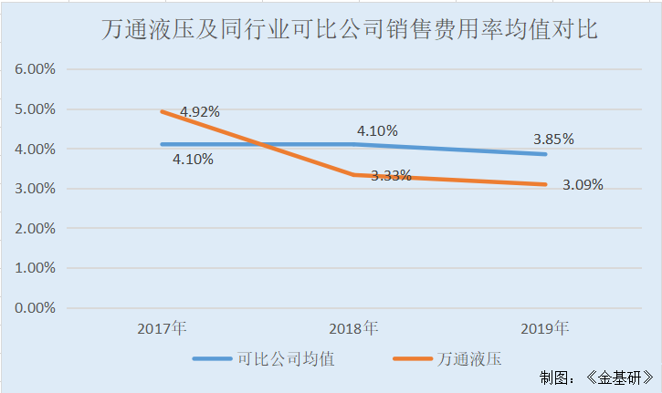 2017-2019年,万通液压的销售费用率分别为4.92%、3.33%、3.09%。