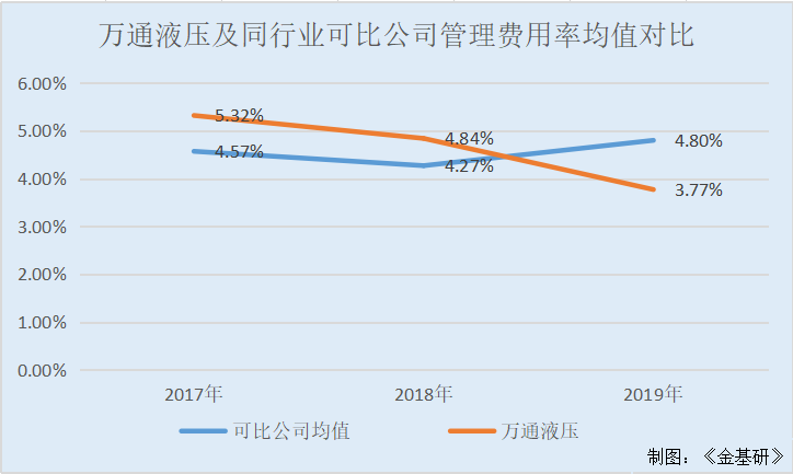 而在管理费用率上,2018-2019年,万通液压管理费用率低于同行业可比公司平均水平。