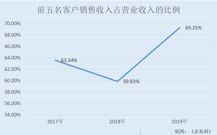 2017-2019年,万通液压对前五名客户的销售收入分别为1.56亿元、2.21亿元、2.17亿元,占万通液压当期营业收入总额的比例分别为63.54%、59.83%、69.25%。