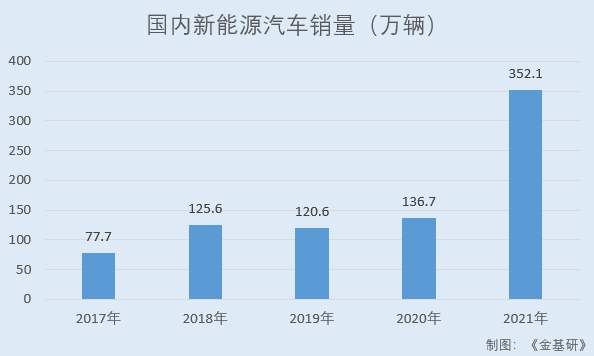 其中,国内新能源汽车市场快速发展。据中国汽车工业协会数据,2017-2021年,国内新能源汽车销量分别为77.7万辆、125.6万辆、120.6万辆、136.7万辆、352.1万辆。特别是在2021年,国内新能源汽车销量同比增长157.5%。