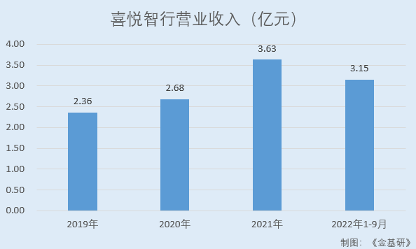 据招股书及年报数据,2019-2021年及2022年1-9月,喜悦智行的营业收入分别为2.36亿元、2.68亿元、3.63亿元、3.15亿元,2020-2021及2022年1-9月分别同比增长13.49%、35.60%、19.87%。