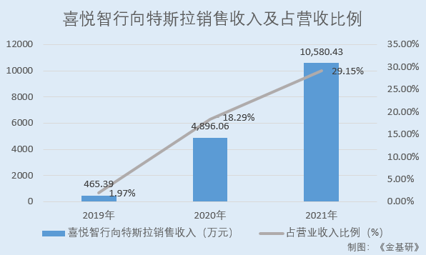 据招股书及年报,2019-2021年,喜悦智行向特斯拉销售收入分别为465.39万元、4,896.06万元、10,580.43万元,占当期主营业务收入比例分别为1.97%、18.29%、29.15%。