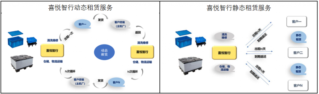 同时,喜悦智行依托对客户需求的深刻理解和提供包装整体解决方案的能力,开展了租赁业务,为客户提供可循环塑料包装的循环供给和后续衍生配送和回收等物流服务,充分契合了客户生产降本的诉求,优化了客户的货物配送供应链。