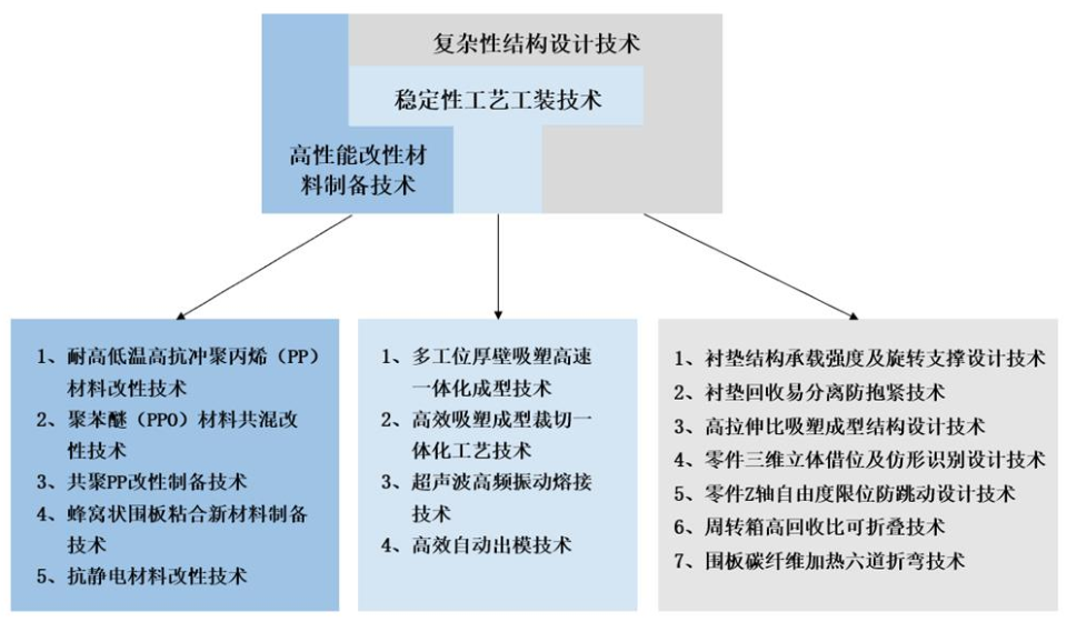 三大技术模块具体包括耐高低温高抗冲聚丙烯(PP)材料改性技术、零件三维立体借位及仿形识别设计技术、衬垫结构承载强度及旋转支撑设计技术、衬垫回收易分离防抱紧技术、多工位厚壁吸塑高速一体化成型技术等。