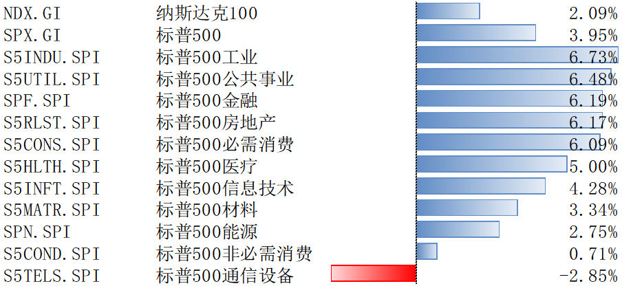 上周,纳斯达克100指数整周上涨2.09%。标普500指数整周上涨3.95%,除通信设备外,其覆盖的10个行业板块全部上涨。其中,工业领涨上涨6.73%,而通信设备下跌-2.85%。