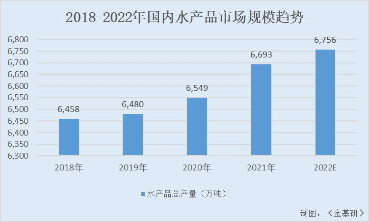 据《国内渔业统计年鉴》数据,2018年至2021年国内水产品总产量总体保持稳定,总产量由6,458万吨增长至6,693万吨,年均复合增长率为1%,2022年国内水产品产量预测将达6,756万吨。
