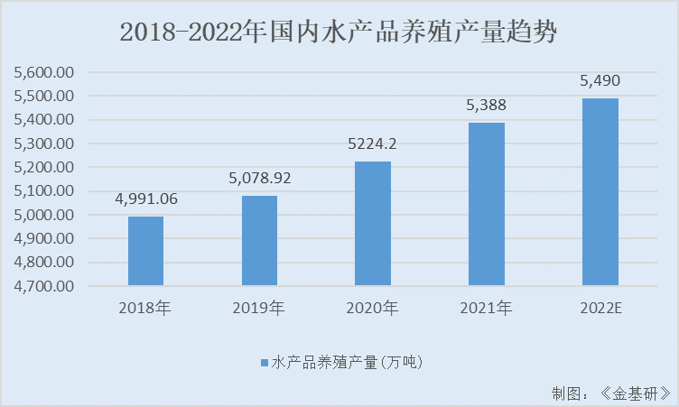 据《国内渔业统计年鉴》数据,2018年至2021年国内水产品养殖产量从4,991.06万吨增长到5,388万吨,2022年国内水产品养殖产量预测将进一步增长到5,490万吨。