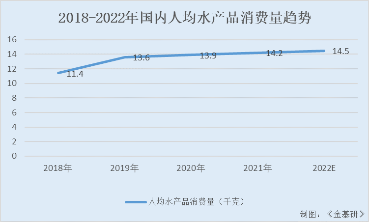 近年来,居民对水产品的需求量不断增加,为国内水产品行业的发展提供了强劲的动力。2018-2021年国内人均水产品消费量从11.4千克增长到14.2千克,2022年国内人均水产品消费量预测将达14.5千克。