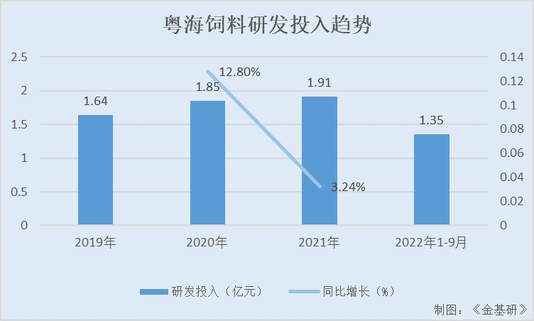 据东方财富Choice数据,2019-2021年及2022年1-9月,粤海饲料的研发投入分别为1.64亿元、1.85亿元、1.91亿元、1.35亿元,2020-2021年研发投入分别同比增长12.8%、3.24%。