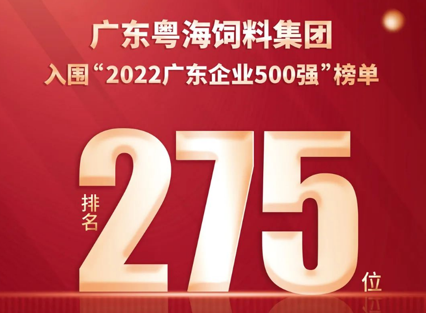 2022年10月,粤海饲料首次入榜“广东省企业500强”, 排名第275位,在广东省制造业企业中排名第135位,此次登榜,是对粤海饲料综合实力的认可。2022年第六届国内水产科技大会上,粤海饲料荣获“2022 年国内水产行业十大卓越贡献奖”,可见,粤海饲料在水产行业的头部地位进一步凸显。