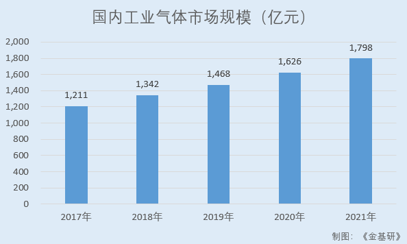 2017-2021年,国内工业气体市场规模分别为1,211亿元、1,342亿元、1,468亿元、1,626 亿元、1,798亿元,年复合增长率10.39%。据亿渡数据预计,2026年国内工业气体行业市场规模将达到2,842亿元。