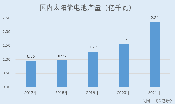 在太阳能电池领域,据国家统计局数据,2017-2021年,国内太阳能电池产量分别为0.95亿千瓦、0.96亿千瓦、1.29亿千瓦、1.57亿千瓦、2.34亿千瓦,预测到2026年,国内太阳能电池产量将达到4.68亿千瓦。