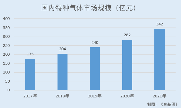 由此,国内特种气体市场规模呈快速上涨态势。据亿渡数据,2017-2021年,国内特种气体市场规模分别为175亿元、204亿元、240亿元、282亿元、342亿元,年均复合增长率达到18.24%。