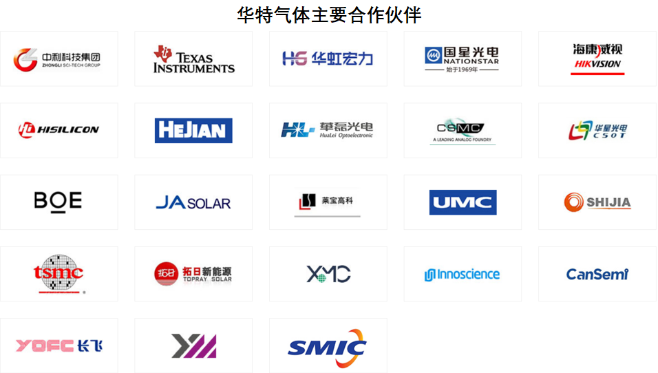 其中,华特气体终端客户主要包括中芯国际、长江存储、华润微电子、士兰微、英诺赛科、HW、HS、合肥晶合、晶科能源、华虹半导体、芯恩(青岛)、和舰芯片制造(苏州)、润阳悦达光伏、仕佳电子、京东方、华星光电、台积电(中国)等;国际大型气体公司主要为液化空气集团、林德集团、日本酸素控股、日本大金工业集团等专业气体公司,也包括部分气体贸易商。