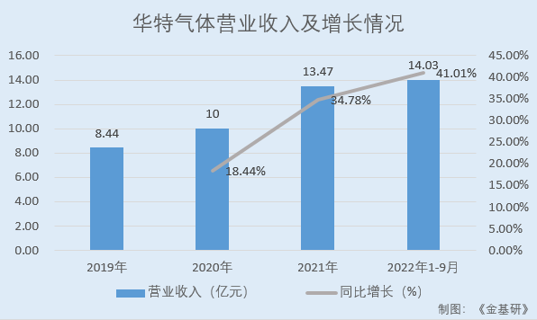 据东方财富choice数据,2019-2021年及2022年1-9月,华特气体的营业收入分别为8.44亿元、10.00亿元、13.47亿元、14.03亿元,2020-2021年及2022年1-9月分别同比增长18.44%、34.78%、41.01%。