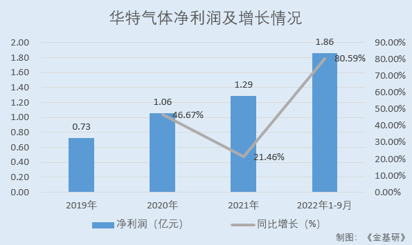 同期,华特气体的净利润分别为0.73亿元、1.06亿元、1.29亿元、1.86亿元,2020-2021年及2022年1-9月分别同比增长46.67%、21.46%、80.59%。